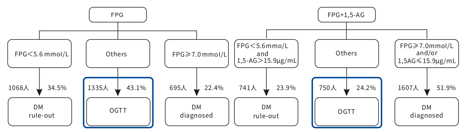 空腹血糖(FPG)聯(lián)合血清1,5-AG檢測,使75.8%受試者避免OGTT,篩查效率?于單純FPG。