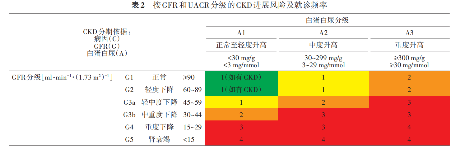 注:GFR為腎小球濾過率;UACR為尿白蛋白/肌酐比值;CKD為慢性腎臟??;表格中的數(shù)字為建議每年復(fù)查的次數(shù);背景顏色代表CKD進展的風(fēng)險:綠色為低風(fēng)險,黃色為中風(fēng)險,橙色為高風(fēng)險,紅色為極高風(fēng)險