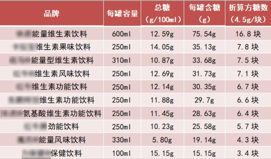 除了會(huì)增加心血管風(fēng)險(xiǎn)外,功能飲料中還含有大量的添加糖。在2020年由深圳市消費(fèi)者委員會(huì)指導(dǎo),深圳市福田區(qū)消費(fèi)者委員會(huì)聯(lián)合深圳市寶安區(qū)消費(fèi)者委員會(huì)對(duì)10款功能性飲料進(jìn)行了比較試驗(yàn)發(fā)現(xiàn):10款樣品中,9款含糖量超10g/100ml,平均含糖量為11.7g/100ml。