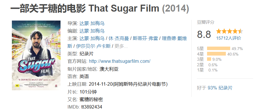 《一部關(guān)于糖的電影》這部紀(jì)錄片不知大家是否看過(guò)?講述的是一個(gè)三年沒(méi)有吃糖的人——達(dá)蒙,在60天內(nèi)每天攝入40勺糖量(~130g碳水化合物)的食物后身體所發(fā)生的變化,這是正常人平均每天的糖攝入量。(感興趣的可以去看一看,你會(huì)發(fā)現(xiàn)不一樣的世界)