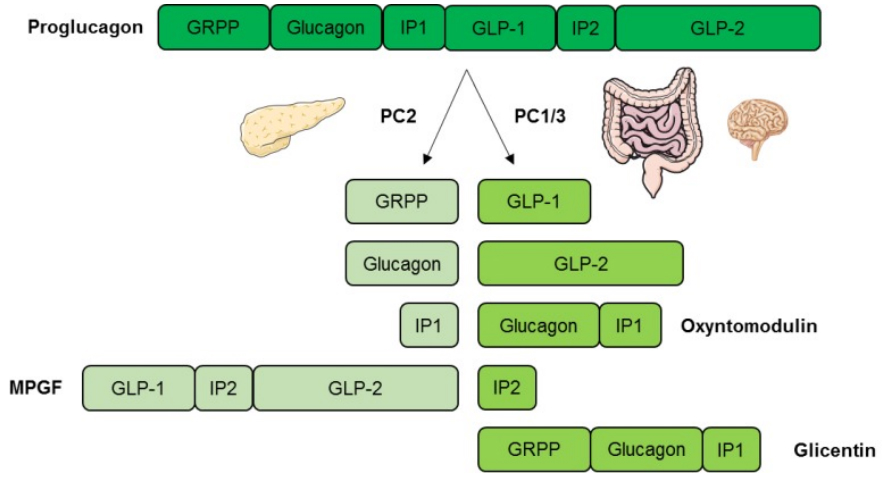 胰高血糖素(Glucagon)是一種主要由胰腺α細胞分泌、含有29個氨基酸的肽類激素,分子量約3.5kD,在血清中的濃度約為2~20pmol/L,主要在肝內(nèi)降解,部分在腎內(nèi)降解。胰高血糖素由胰高血糖素原(Proglucagon)衍生而來,后者可被加工成多種相關(guān)的肽類激素。胰高血糖素原在胰島α細胞、腸道內(nèi)分泌的L細胞中都有表達,在腦干和下丘腦的神經(jīng)元中也有少量表達。胰高血糖素原分別由激素原轉(zhuǎn)化酶1/3(PC1/3)和激素原轉(zhuǎn)化酶2(PC2)處理。在胰腺中,PC2將胰高血糖素原加工成胰高血糖素,而在腸道和大腦中,胰高血糖素原由PC1加工,形成胰高血糖素樣肽1(GLP-1)和胰高血糖素樣肽2(GLP-2)。