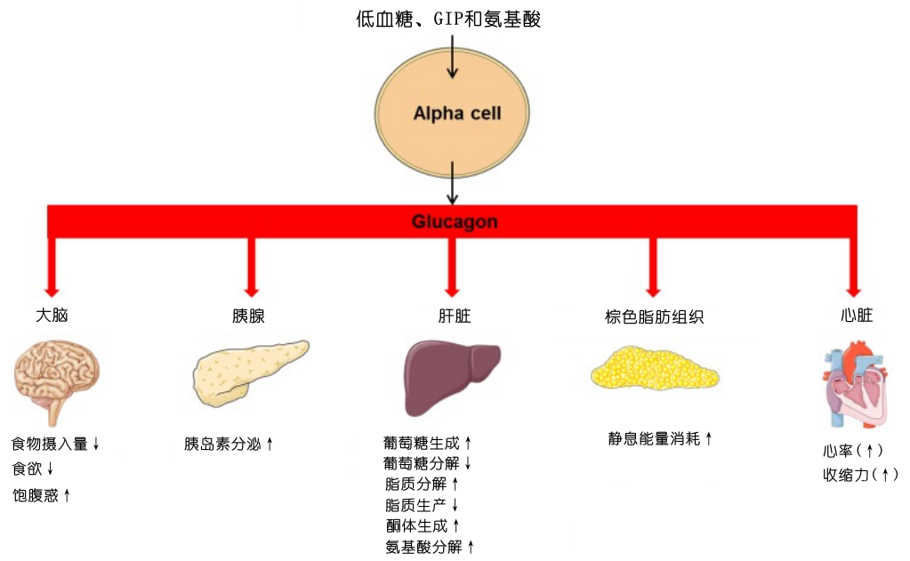 胰高血糖素是一種葡萄糖調(diào)節(jié)激素,它通過刺激肝臟產(chǎn)生葡萄糖來抵消胰島素的作用,從而提高血糖水平。胰高血糖素能介導(dǎo)幾種非葡萄糖代謝作用,這些作用包括通過肝臟脂肪分解和酮體生成調(diào)動能量資源、刺激肝臟氨基酸代謝以及相關(guān)的尿素生成。