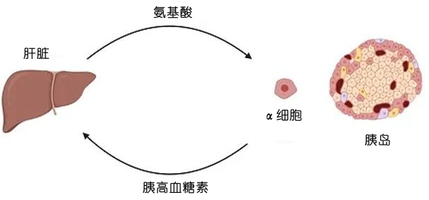 在長期禁食期間,胰高血糖素會通過上調(diào)參與氨基酸葡萄糖生成過程的酶,刺激該過程(通過葡萄糖生成)形成葡萄糖。胰高血糖素可促進氨(脫氨基過程中產(chǎn)生的有毒副產(chǎn)物)轉(zhuǎn)化為尿素,并隨尿液排出體外。因此,胰高血糖素可降低血液中的氨含量。抑制胰高血糖素受體會破壞胰高血糖素的作用,導(dǎo)致血漿中氨基酸水平升高和胰腺α細胞增生,進而導(dǎo)致胰高血糖素分泌過多。這表明,胰高血糖素和氨基酸在肝臟和胰腺α細胞之間的反饋回路中存在聯(lián)系。